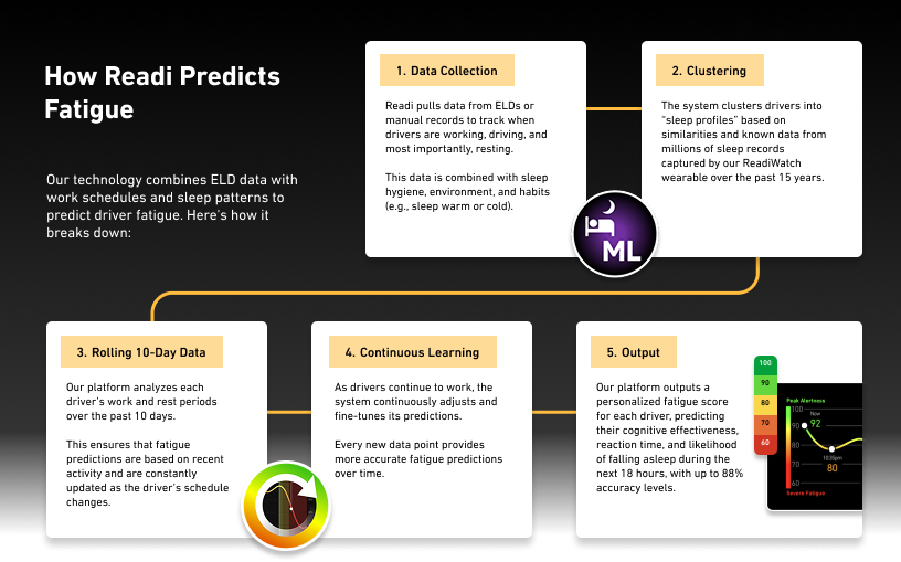 Many fleets are wary of requiring wearables. Cost, deployment, driver acceptance, privacy and union issues can all complicate rollout. Readi sidesteps those hurdles with a platform that: